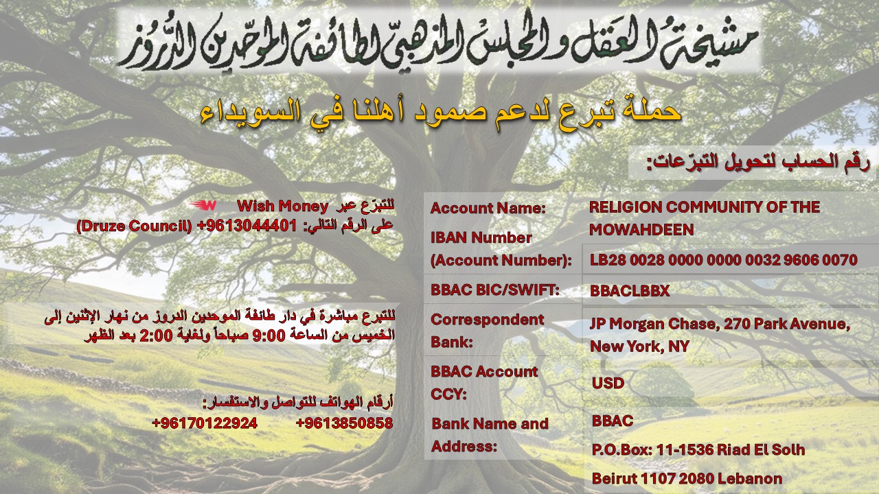 > سماحة شيخ العقل بحث مع مطران الكاثوليك في اللاذقية وطرطوس العلاقات الإسلامية المسيحية المشتركة > حملة تبرّع لدعم صمود أهلنا في السويداء > سماحة شيخ العقل زار راشيا وحاصبيا ورأس المتن: "التحدّيات المصيرية تزيدنا عزماً للتمسك بثوابتنا التوحيدية ومواجهة المخططات" > سماحة شيخ العقل في الذكرى الستين للوثيقة الڤاتيكانية: "ننادي بالشراكة الروحية الوطنية ونُصرُّ عليها مع البطريركية المارونية الموقَّرة كمظلّةٍ واقية ... > سماحة شيخ العقل التقى وفدا من طرابلس ورؤساء المحاكم المذهبية الدرزية: لبنان يحتاج للتضامن الداخلي في ظل المخاطر والتحديات > سماحة شيخ العقل في توقيع اتفاق التنمية الاقتصادية مع الرهبانية المارونية: تكرس الرؤية الموحدة والشراكة الفعلية كجزء من المسؤولية الوطنية ... > سماحة شيخ العقل شارك في ورشة عمل محاكم الأسرة في العالم العربي داعيا لرفع الظلم عن جميع عناصر الأسرة > سماحة شيخ العقل يدعو المسؤولين للتضامن الداخلي بوجه الاخطار والرؤساء الروحيين لتقديم رسالة مشتركة للبابا لاوون > سماحة شيخ العقل عرض مع السفير السعودي التطورات والتقى وفدا ممثلا للبطريرك الراعي > سماحة شيخ العقل إطّلع من السفير بورجيا على تحضيرات زيارة البابا: "نأمل أن تحمل بشائر الاستقرار والسلام وتساهم في تجنيب ...