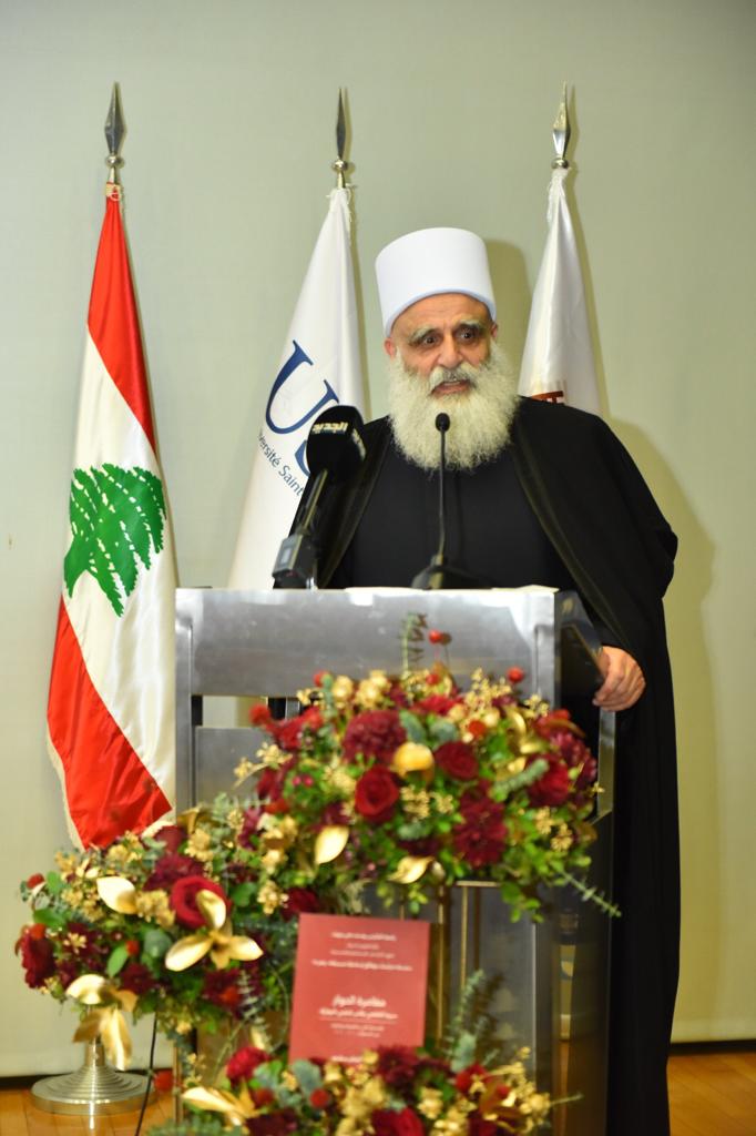 يُسعدُني أن أعودَ إلى منبرِ جامعة القديس يوسف ورحابِها من موقعي المرجِعيّ المسؤول، بعد أن أمضيتُ ستَّ سنواتٍ بين صفوفِها وقاعاتِها طالباً محتضَناً بمحبة أسرة معهد الدراسات الإسلامية والمسيحية، واضعاً المدماكَ الأوَّلَ لأخوةٍ موحِّدينَ أعزَّاء تشجَّعوا واندفعوا لخوض مغامرة الحوار التي قادنا إليها الأستاذ عباس الحلبي، وكنَّا أحدَ دعاتِها المخلصين منذ أن طوينا معاً صفحة الحرب والنزاع وانفتحنا بكلِّ كليِّتِنا على ثقافةٍ متأصِّلةٍ في نفوس شيوخِنا الأطهار وتراثِنا المعروفيِّ الأصيل ومسلكِنا التوحيديِّ الشريف.