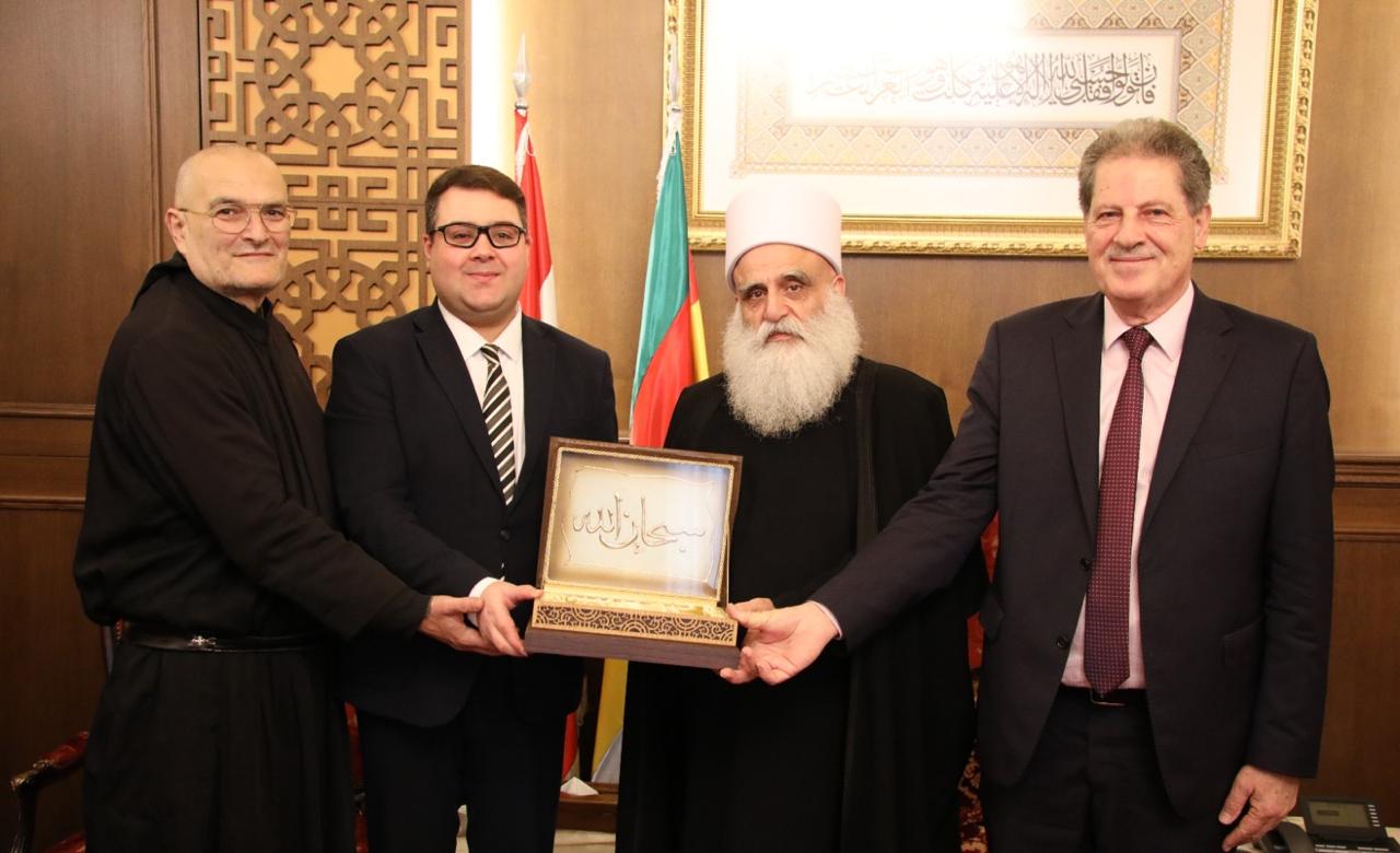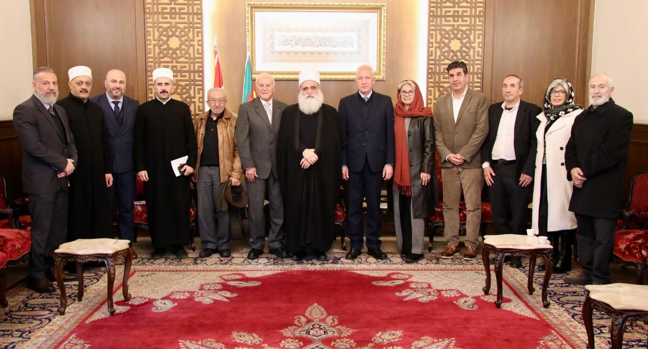 والتقى ايضاً وفد "المنظمة العالمية لحوار الأديان والحضارات – أويسكو"، الذي ضمّ: الأب الدكتور جميل إسكندر، الدكتور منير حمزة، والأستاذ زكريا مخلص الجدة. وأكد الوفد خلال اللقاء على "أهمية ترسيخ نهج الحوار البنّاء وتعزيز قيم التفاهم والتقارب بين المكوّنات الدينية والثقافية، بما يسهم في صون السلم الأهلي وتعزيز القيم الإنسانية المشتركة". وقدّم الاب اسكندر لسماحته، كتابه: "مريم في القرآن - بين المصادر المسيحية والتصوير"، الصادر حديثًا عن المنظمة، ولدعوته الى حفل توقيعه في 25 آذار القادم، كما قدَّم الأستاذ الجدّة باسم والده الدكتور مخلص الجدّة مصحفاً قرآنياً محفوظاً في صندوق خشبيٍّ أثري.